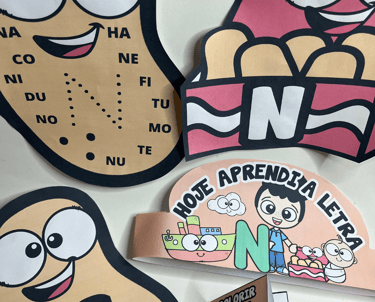 ✅ Recursos de Interação: Coroas, adereços e cartões para as crianças "vestirem" o conhecimento.